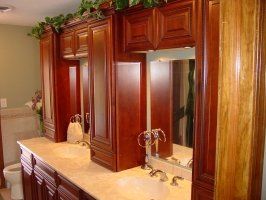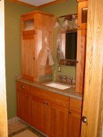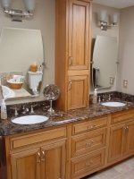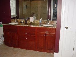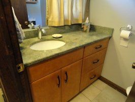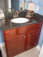 Aristokraft - Saybrook door style - Birch wood - Rouge stain - Rainforest Green granite vanity top