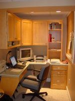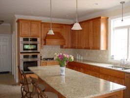 Omega Dynasty - Marion door style - Maple wood - Honey stain - Formica Gemlock Laminate Countertop in "Zen Paint" with Corian "Cameo White" edge