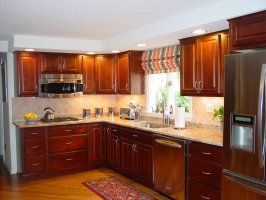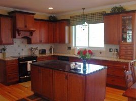 Omega Custom & Dynasty - Guthrie door style - Cherry wood - Cinnamon stain w/coffee glaze on Perimeter cabinets and Lexington Square Inset door style - Cherry wood - Tuscany finish on Island cabinets - Blue Flower granite
